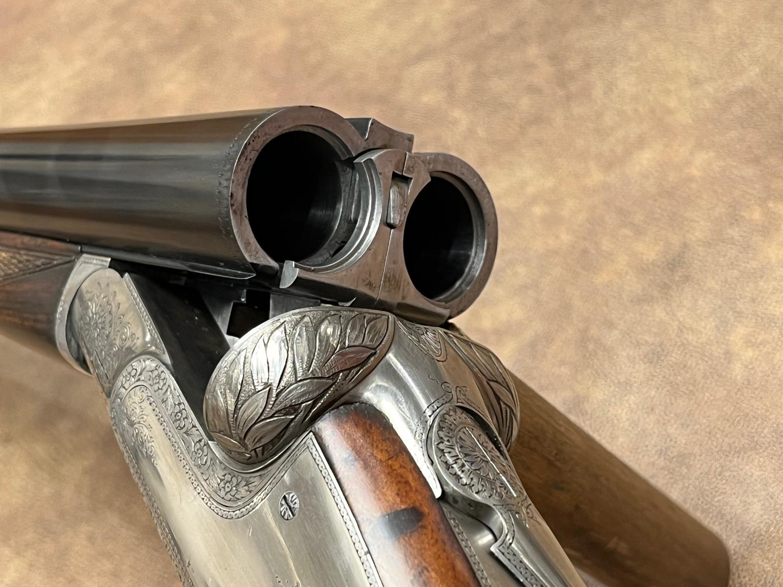 Juxtaposegeweer Lebeau Courally, contreplatines, kaliber 12 en loop van 70 cm, vaste chokes 5/10 & 7/10, dubbele trekkers en uitwerpers met grote ontwikkeling. Engelse kolf van 360 mm.
