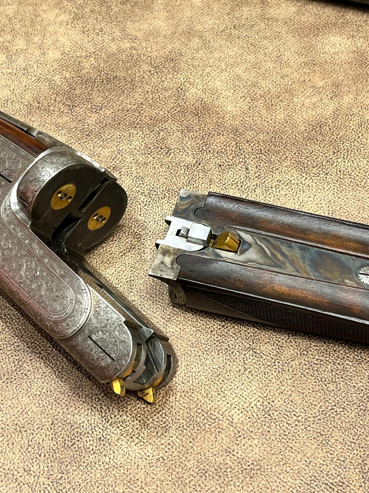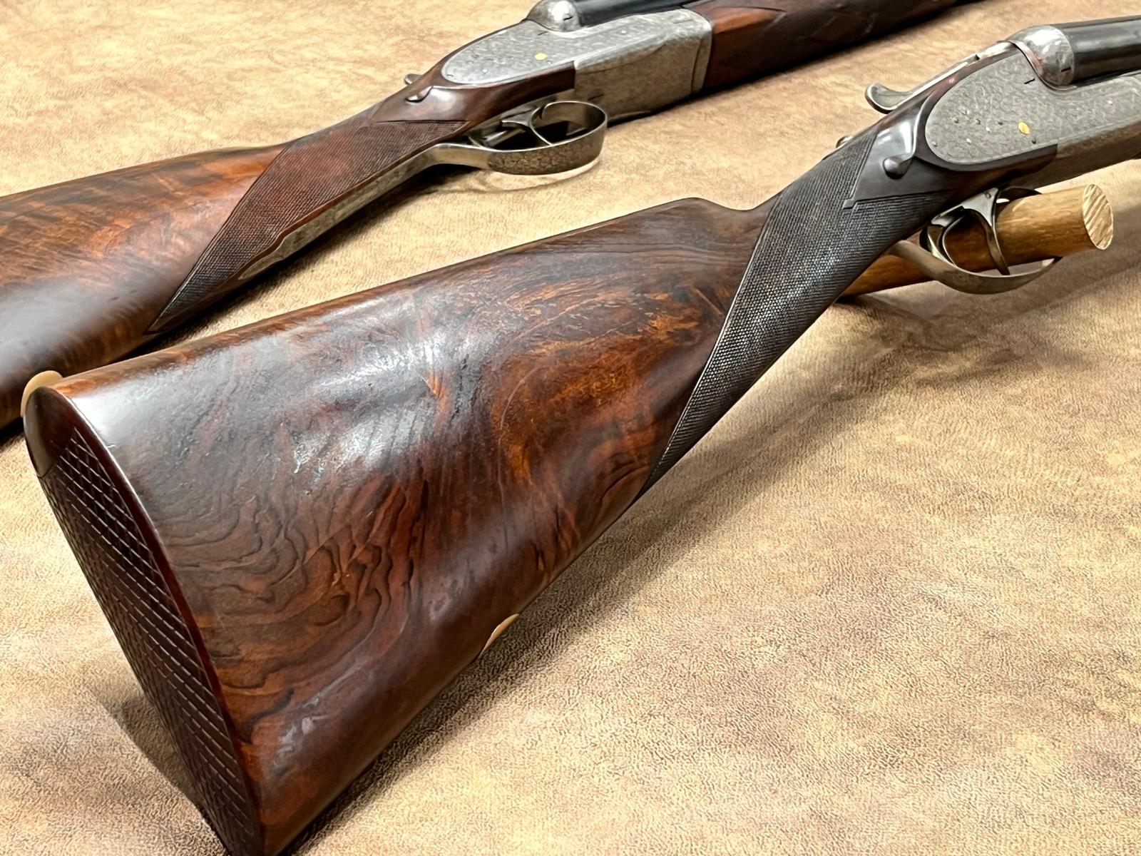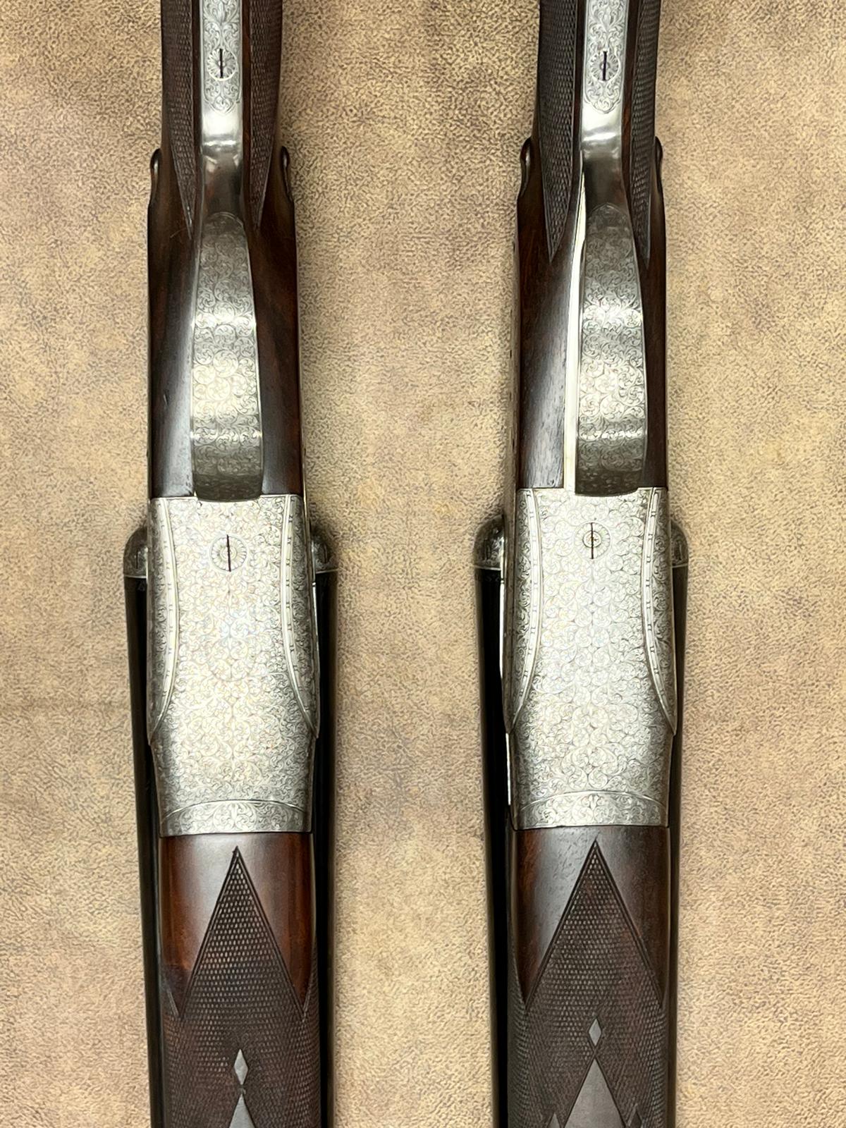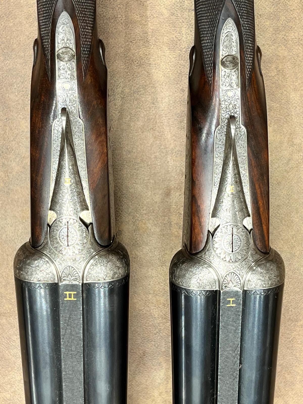 Kaliber 12. Opeenvolgende nummers. Anson-systeem met platines. Dubbele gearticuleerde trekkers. Gouden inlegstukken in het mechanisme. Fijne Engelse boeketgravure. Engelse kolf, 355 mm. Ejectoren met grote uitwerping. Lopen van 70 cm voor beide wapens. Vaste chokes: geweer I 2/10 & 6/10, geweer II 4/10 & 6/10.