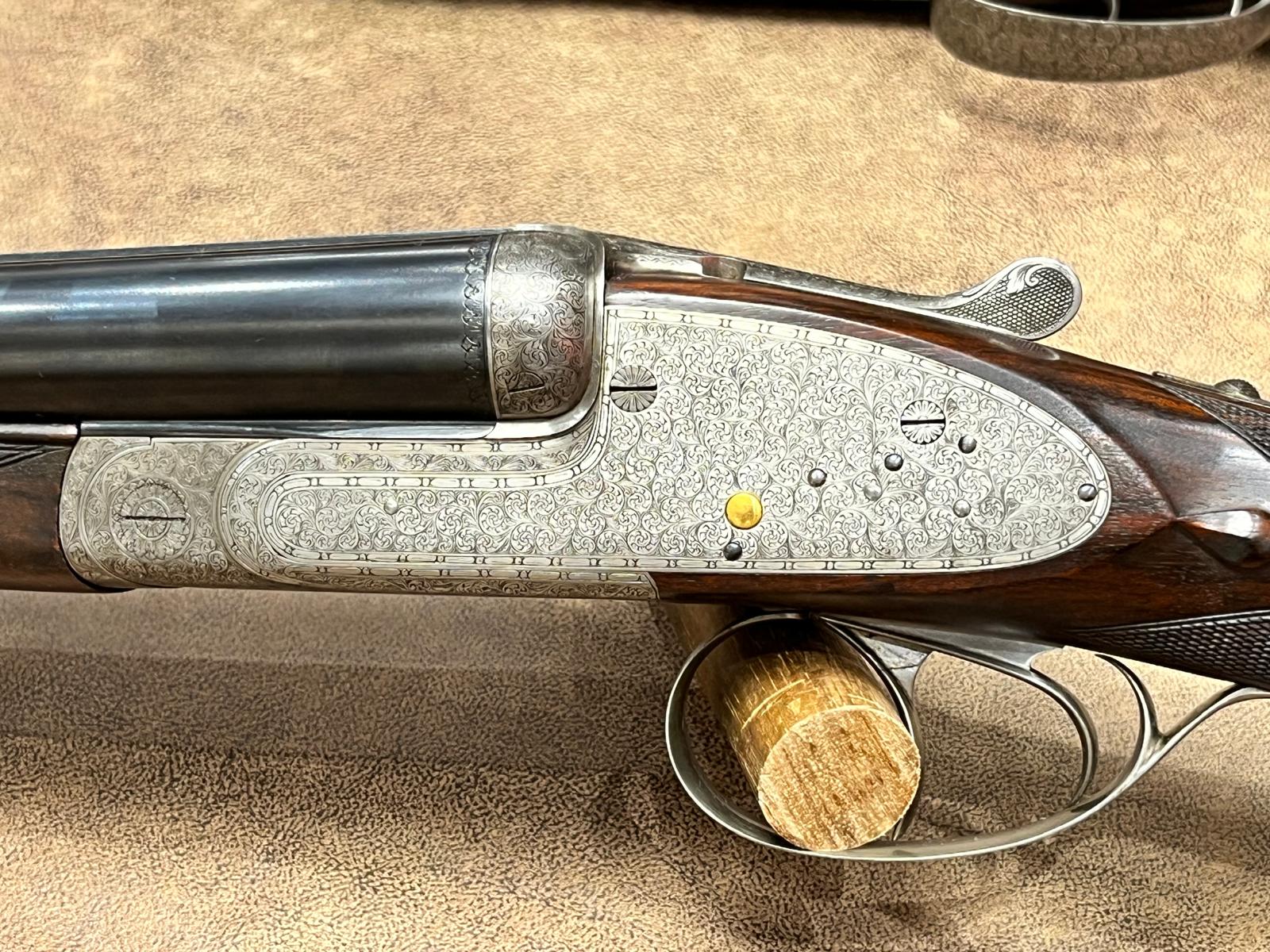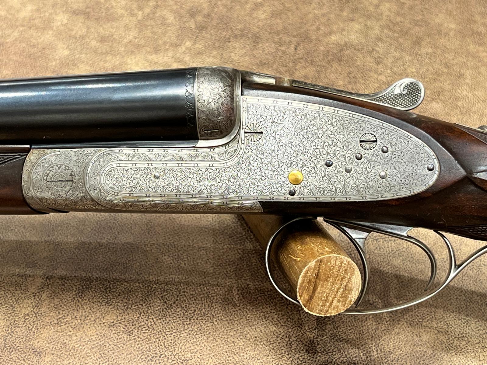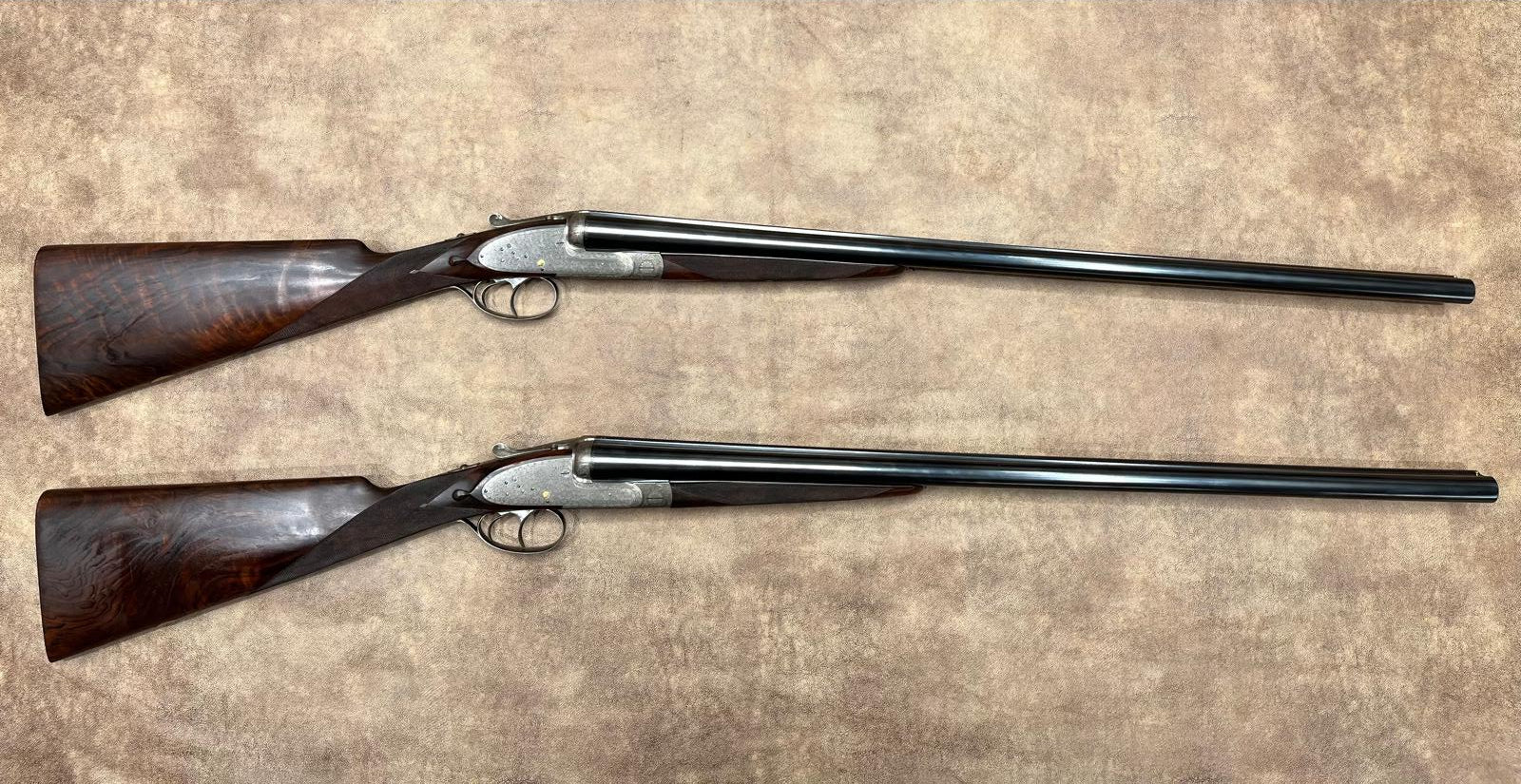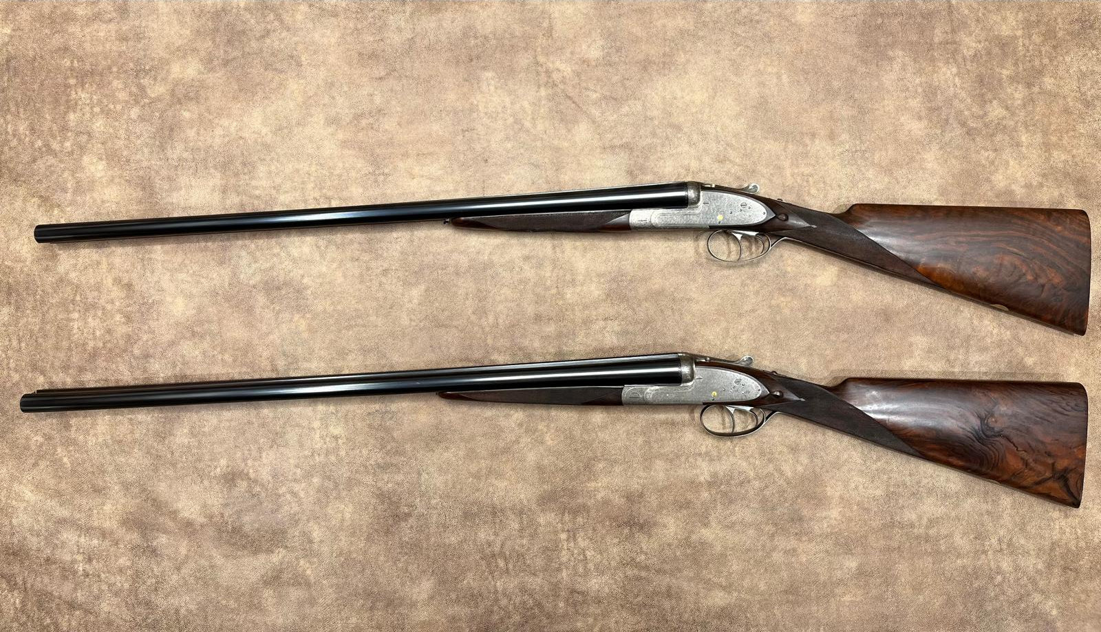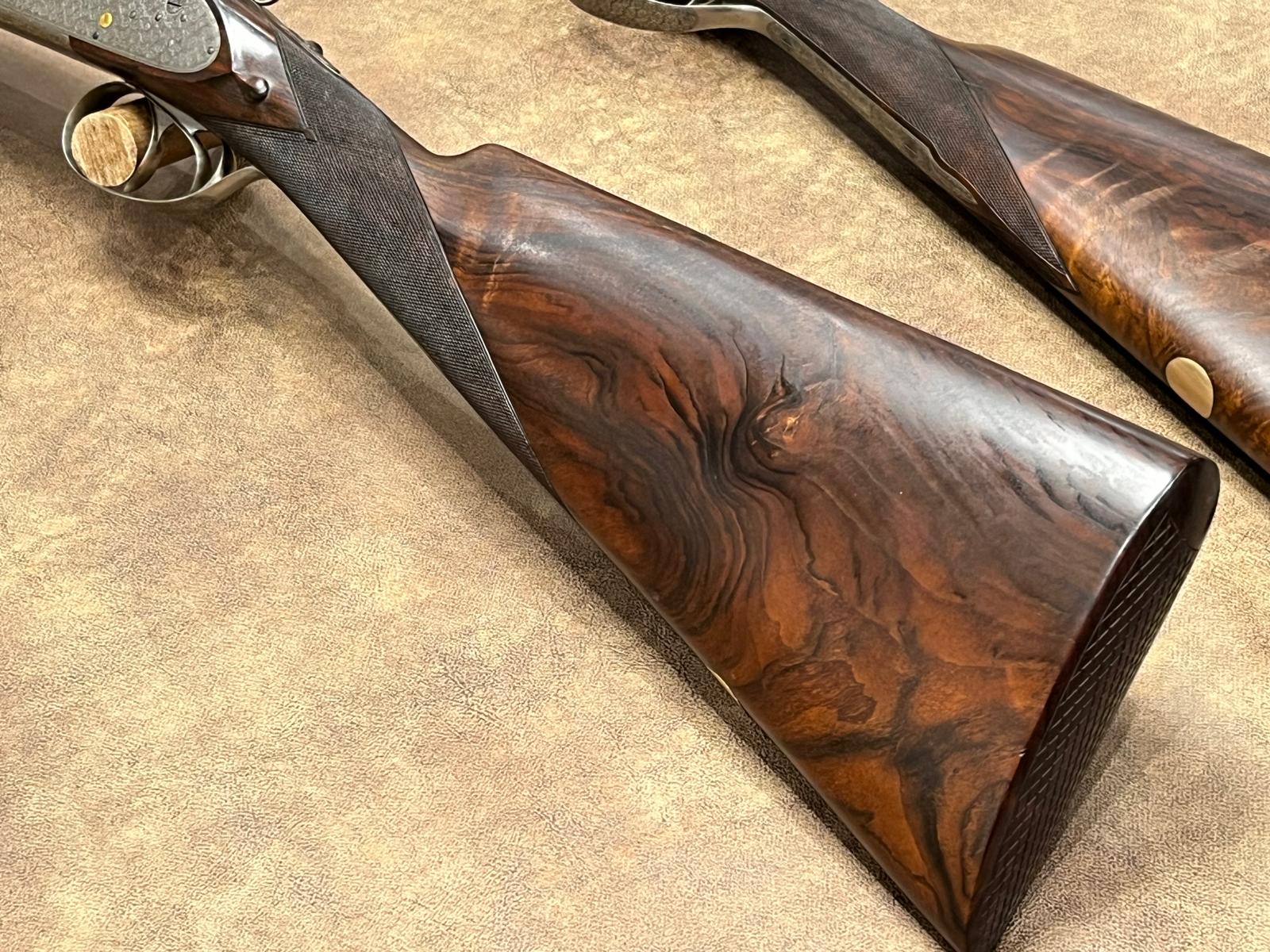 Kaliber 12. Opeenvolgende nummers. Anson-systeem met platines. Dubbele gearticuleerde trekkers. Gouden inlegstukken in het mechanisme. Fijne Engelse boeketgravure. Engelse kolf, 355 mm. Ejectoren met grote uitwerping. Lopen van 70 cm voor beide wapens. Vaste chokes: geweer I 2/10 & 6/10, geweer II 4/10 & 6/10.