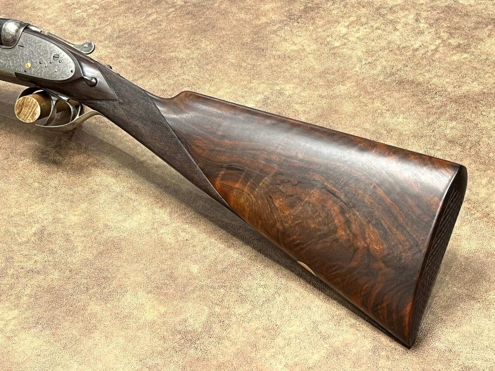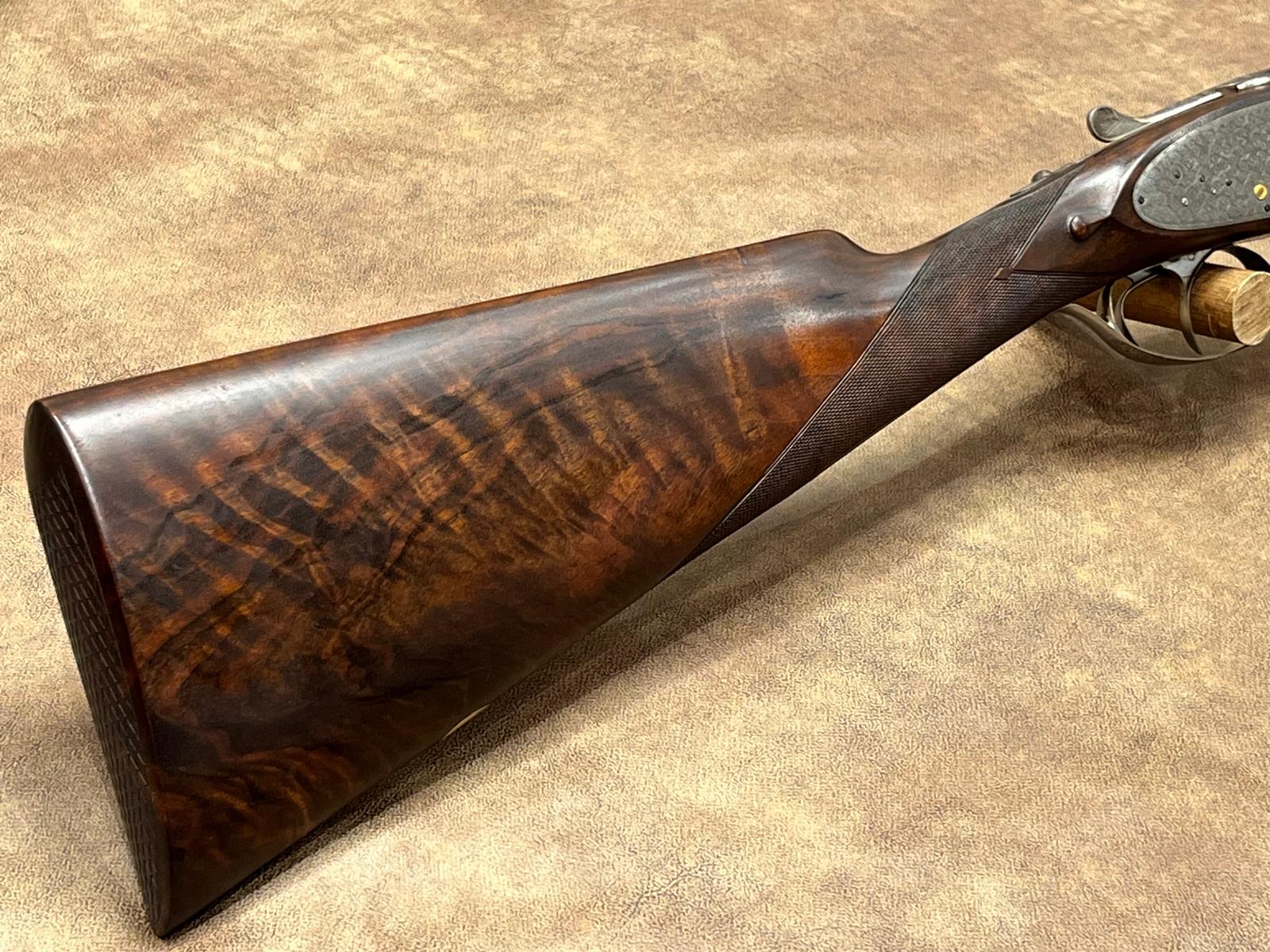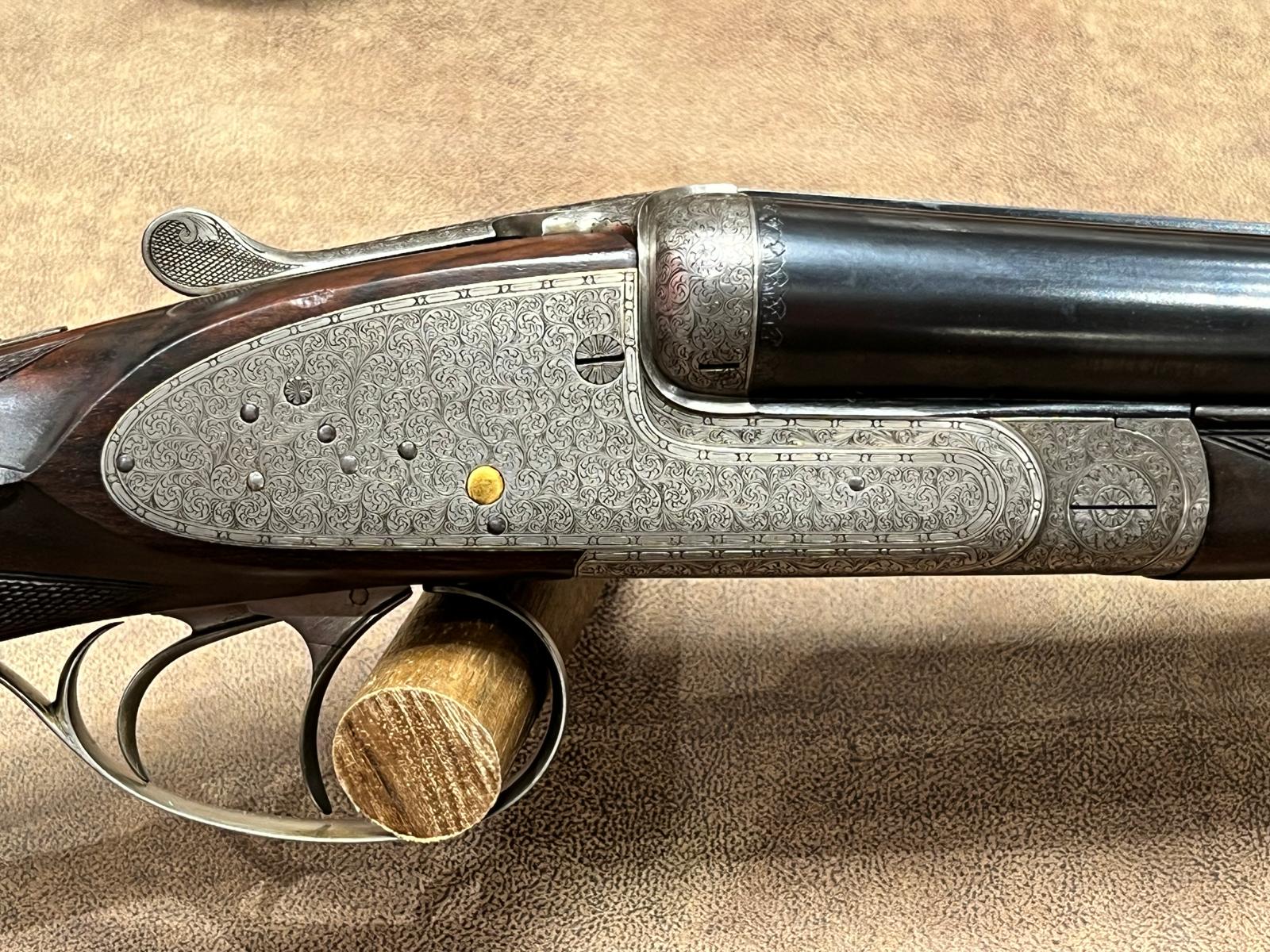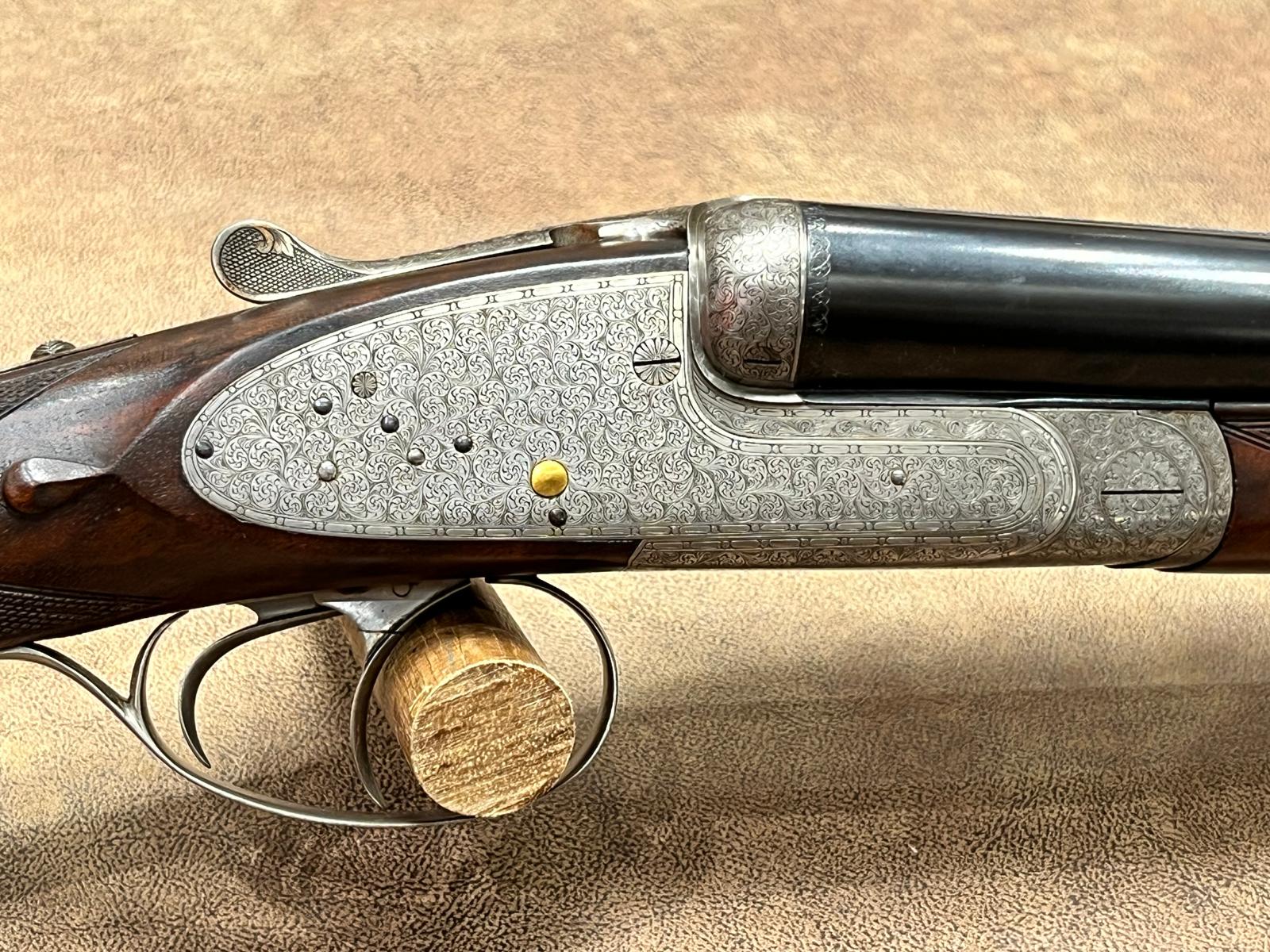 Kaliber 12. Opeenvolgende nummers. Anson-systeem met platines. Dubbele gearticuleerde trekkers. Gouden inlegstukken in het mechanisme. Fijne Engelse boeketgravure. Engelse kolf, 355 mm. Ejectoren met grote uitwerping. Lopen van 70 cm voor beide wapens. Vaste chokes: geweer I 2/10 & 6/10, geweer II 4/10 & 6/10.